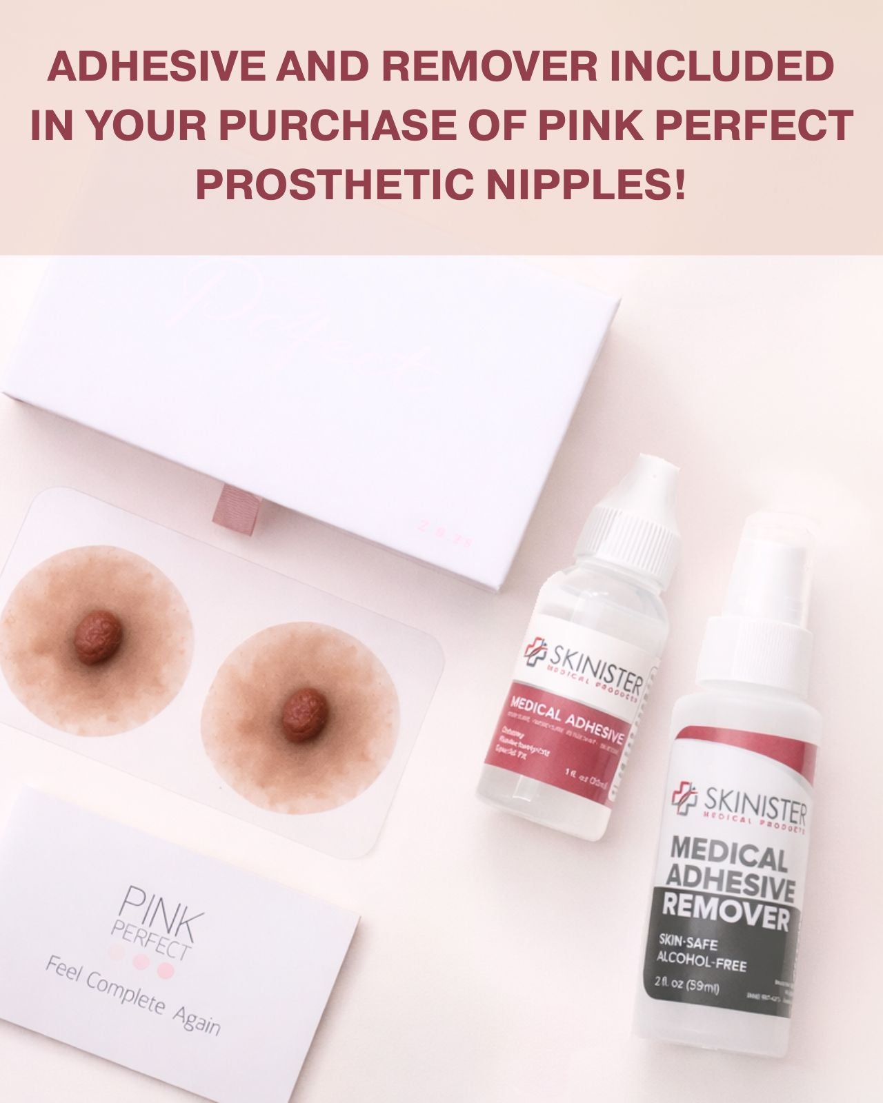 -Includes Skinister Medical Grade Adhesive and Remover with every purchase of Pink Perfect nipples. This medical-grade adhesive provides a strong, water-resistant bond and can extend the wear up to 14 days. The remover is a silicone based, hypoallergenic solution that provides rapid removal of the adhesive without damage to prosthetic nipple. The remover is scent free and alcohol free. Adhesive and Remover must be used together.