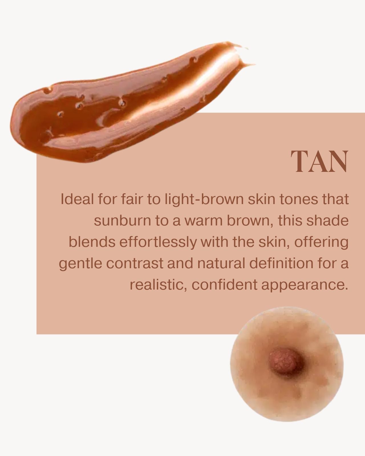 Pink Perfect’s Prosthetic Nipples tan are designed to work great on skin tones with orange or olive undertones. Think if you are out in the sun- you your skin tends to skip the turn and go straight to a tanned, the tan shade is the color for you.