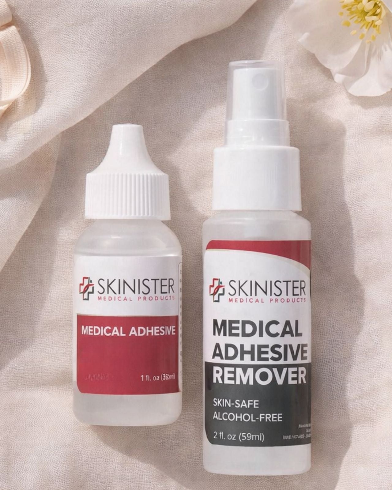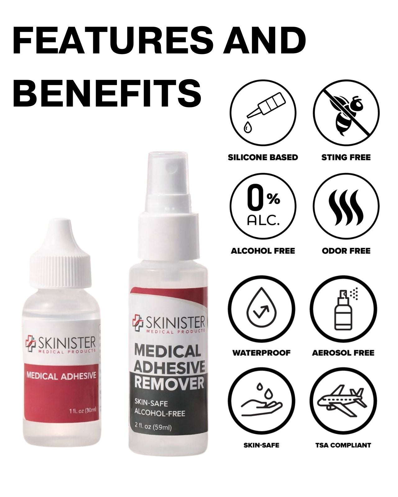 The Skinister Medical Grade Adhesive and Remover Bundle contains is a medical-grade adhesive that provides a strong, water-resistant bond and can extend the wear up to 14 days as well as spray remover that allows your prosthetics to be gently removed from your skin without product damage or skin discomfort.