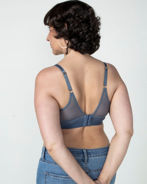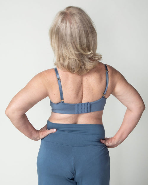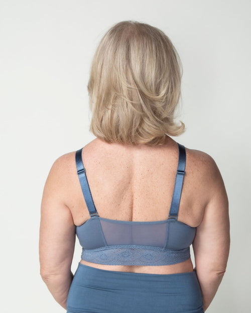 Black / Mastectomy & longline pullover bra with a lace trim, soft cups, mesh back, adjustable straps on mastectomy model with breast forms. Black / Mastectomy & longline pullover bra with a lace trim, soft cups, mesh back, adjustable straps on mastectomy model with breast forms back view