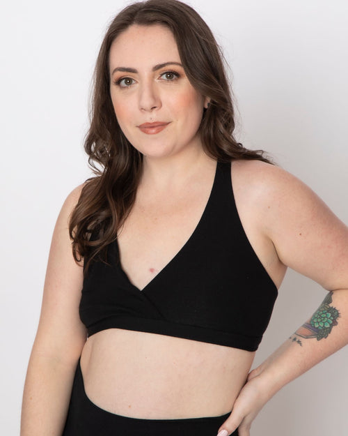 Black / Implants & model wearing the Victoria Pocketed Keyhole bralette with gold lace trim and gold jewel that says anaono Black / Implants & model wearing the Victoria Pocketed Keyhole bralette with gold lace trim and gold jewel that says anaono