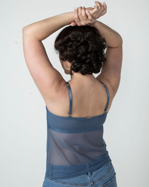 Slate / Implants & pocketed mesh camisole with built in shelf bra for extra support, semi sheer lightweight fabric front view Slate / Implants & pocketed mesh camisole with built in shelf bra for extra support, semi sheer lightweight fabric back view