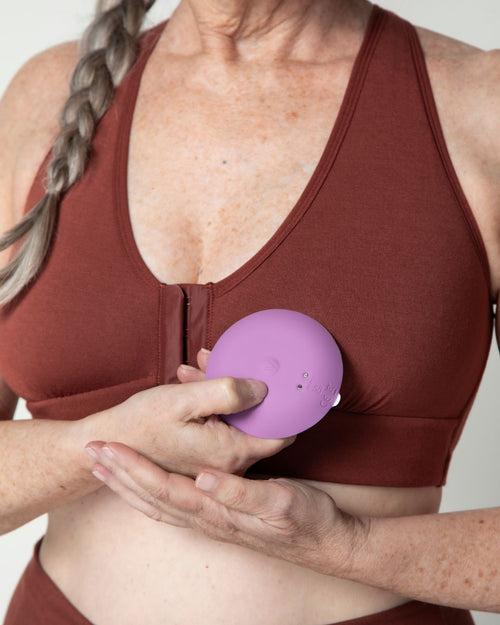 Blush / Mastectomy & pocketed full coverage t-shirt bra with soft wire free cups, back hook closure and adjustable straps on model. Blush / Mastectomy & pocketed full coverage t-shirt bra with soft wire free cups, back hook closure and adjustable straps on model.
