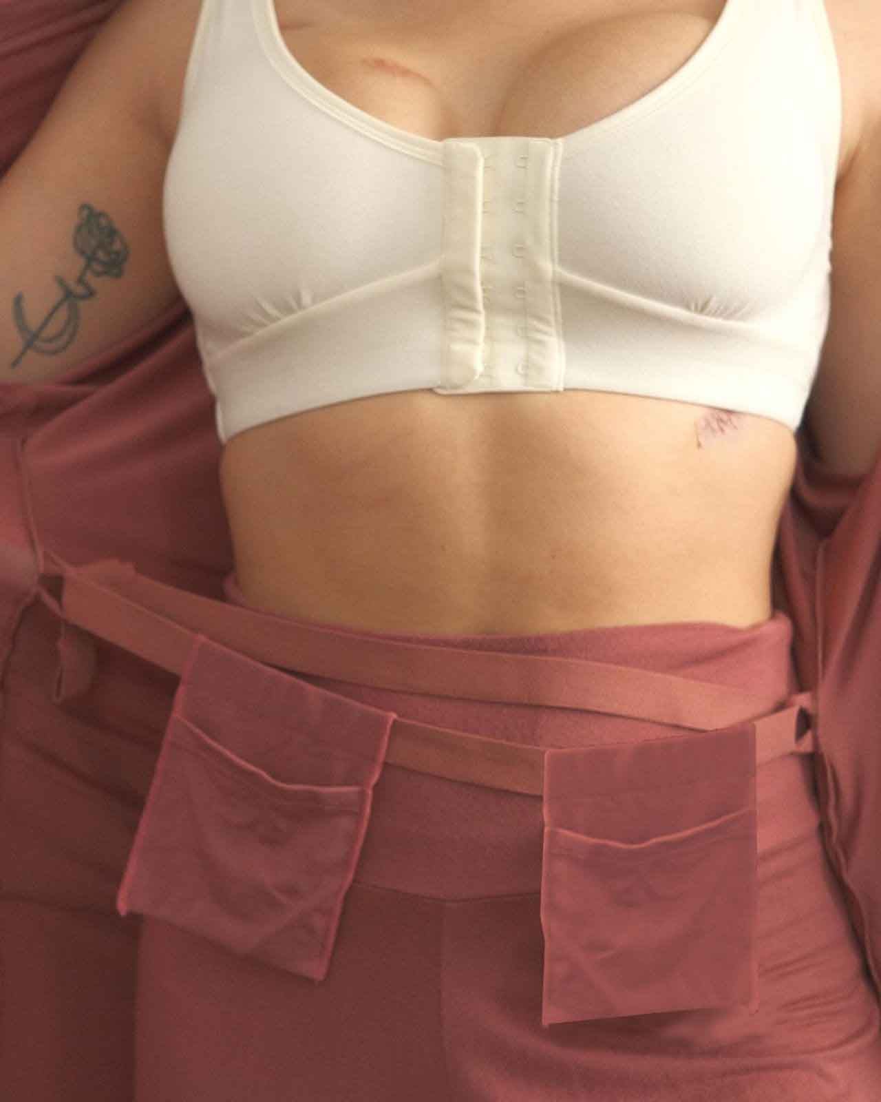 "The additional drain management belt is such a life saver when you have drains post-op. They keep the bulbs snug and out of you way and keep me comfortable all day long." - Amy