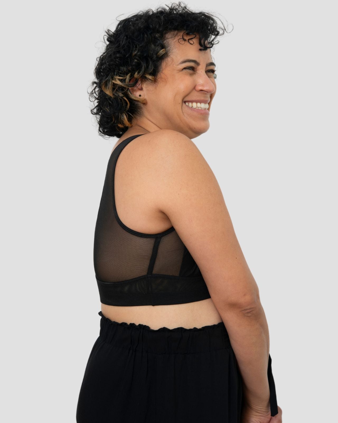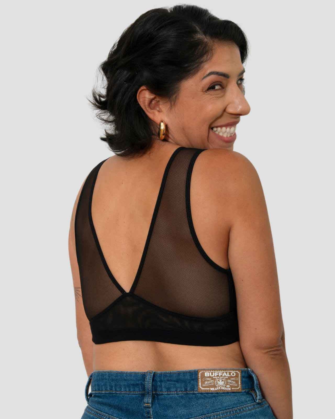 Black / Mastectomy & pocketed mesh babydoll lingerie with mesh detail and criss cross tie back side and view Black / Mastectomy & pocketed mesh babydoll lingerie with mesh detail and criss cross tie back side and view