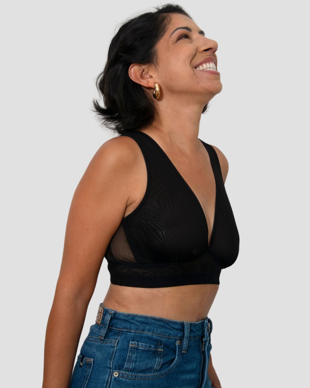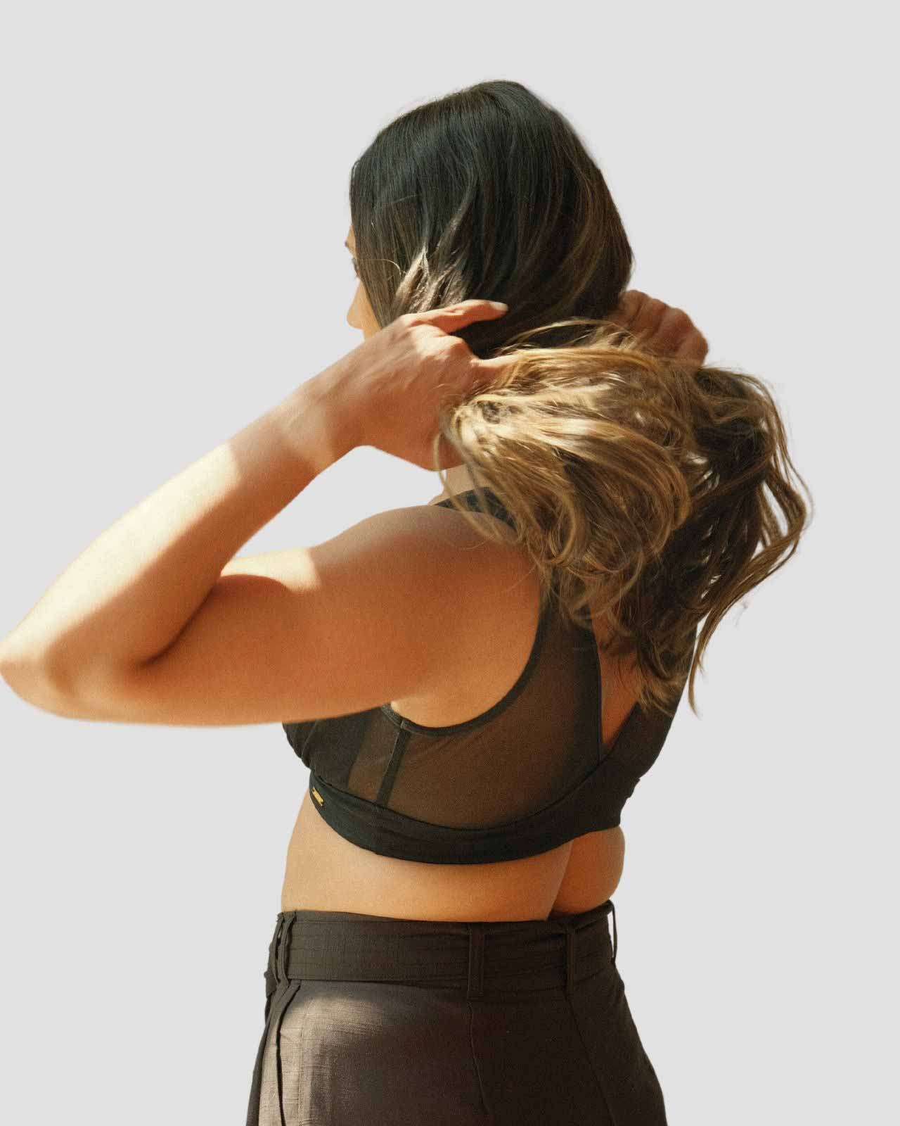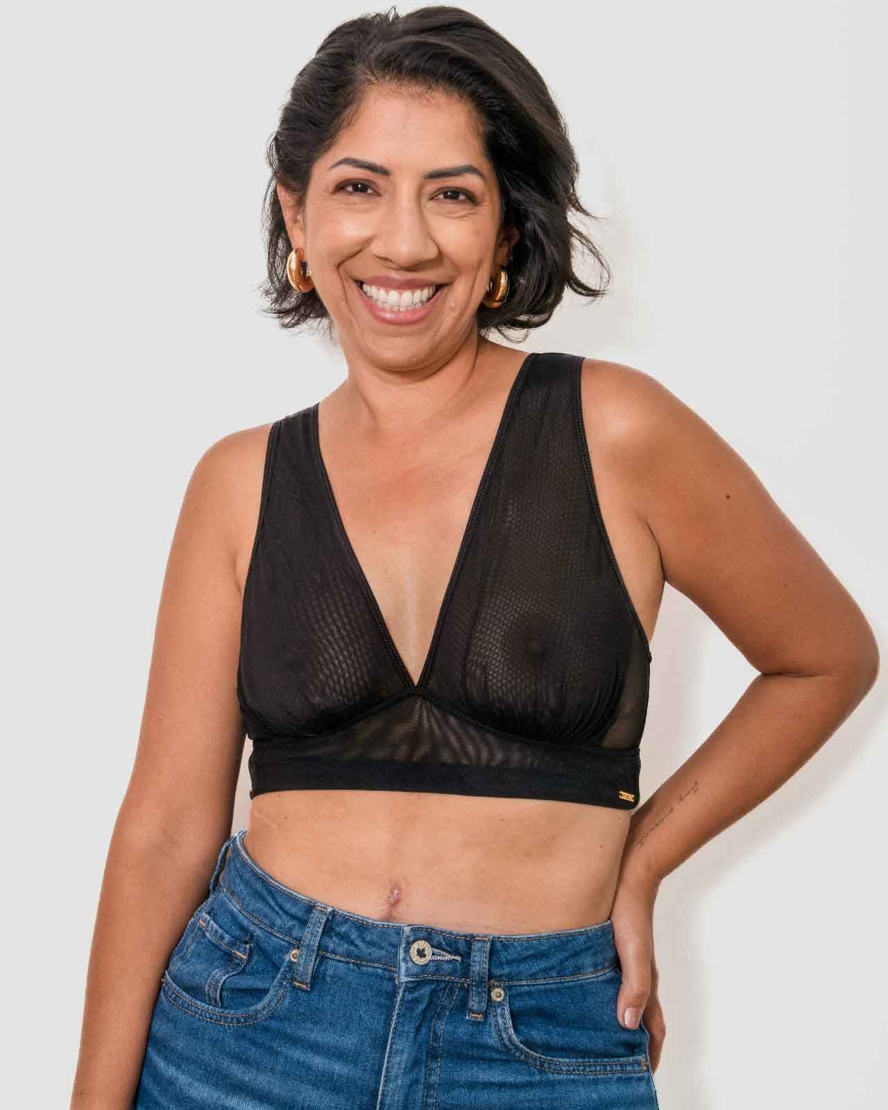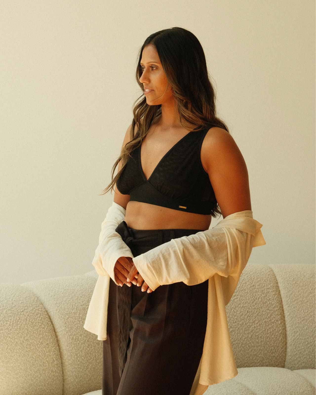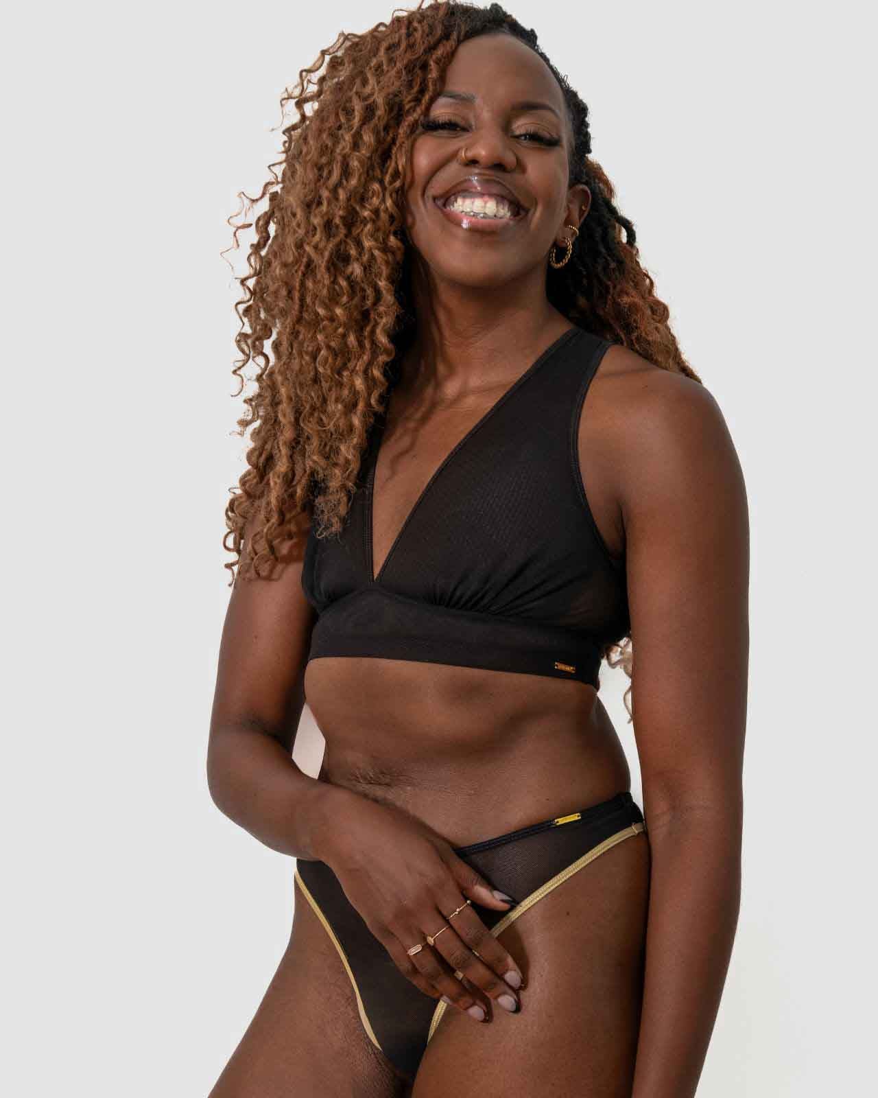 Black / Implants & model wearing the Victoria Pocketed Keyhole bralette with gold lace trim and gold jewel that says anaono Black / Implants & model wearing the Victoria Pocketed Keyhole bralette with gold lace trim and gold jewel that says anaono