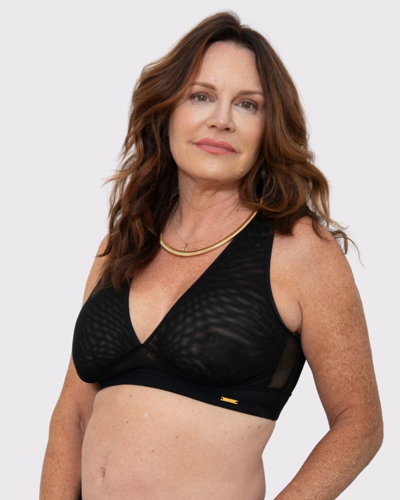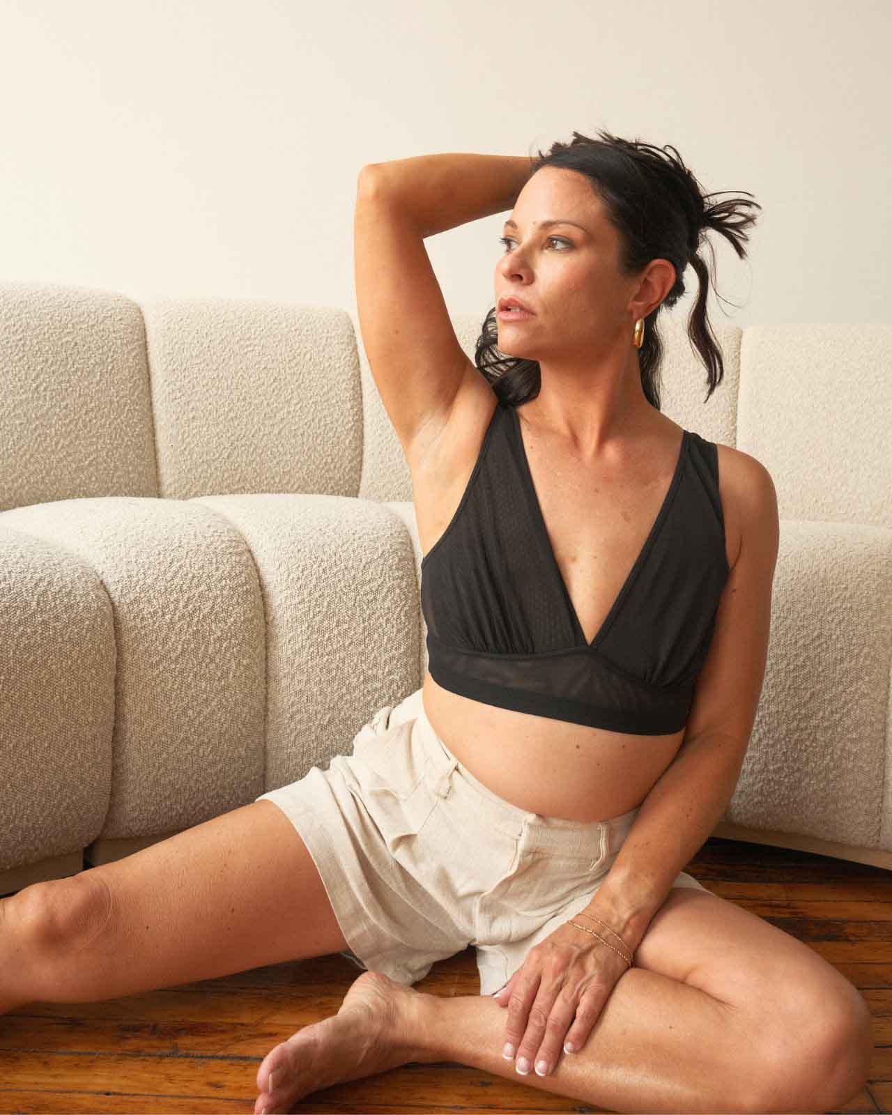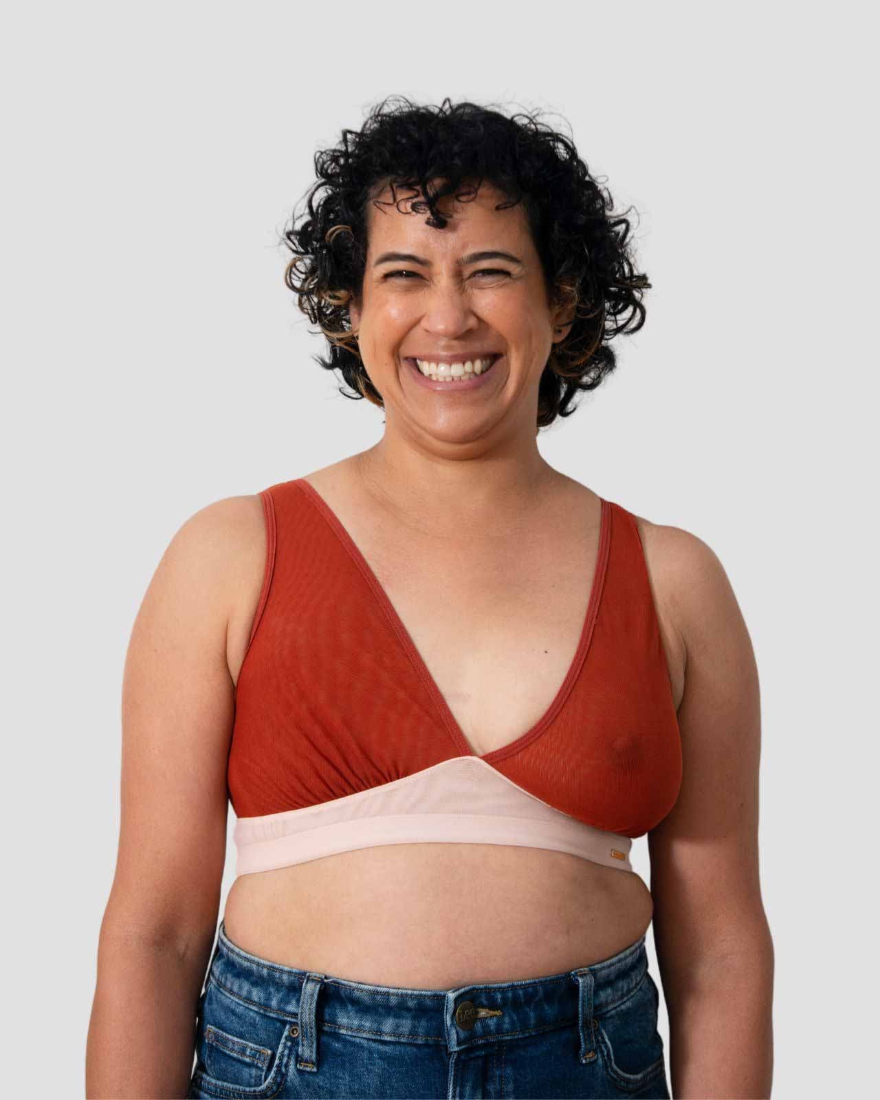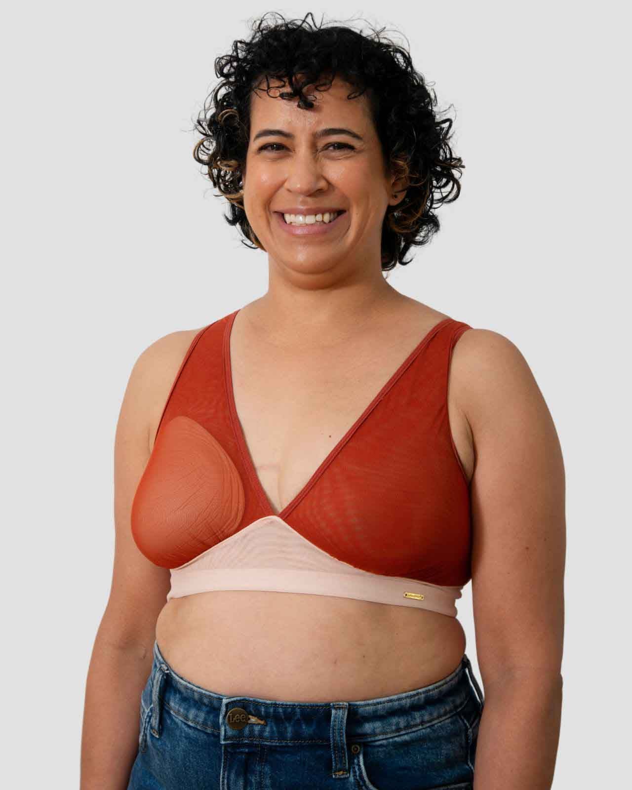 Black / Implants & model wearing the Victoria Pocketed Keyhole bralette with gold lace trim and gold jewel that says anaono Black / Implants & model wearing the Victoria Pocketed Keyhole bralette with gold lace trim and gold jewel that says anaono