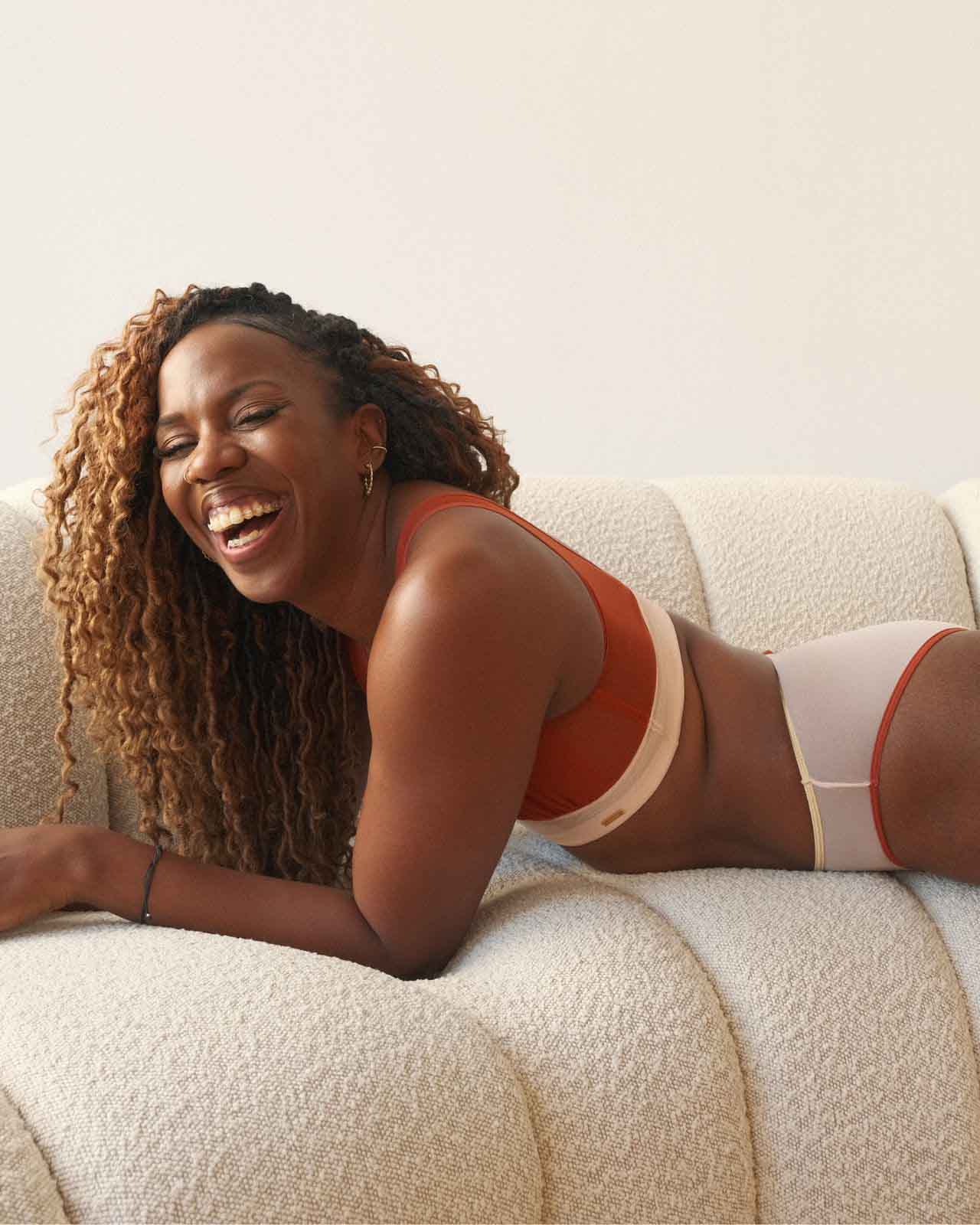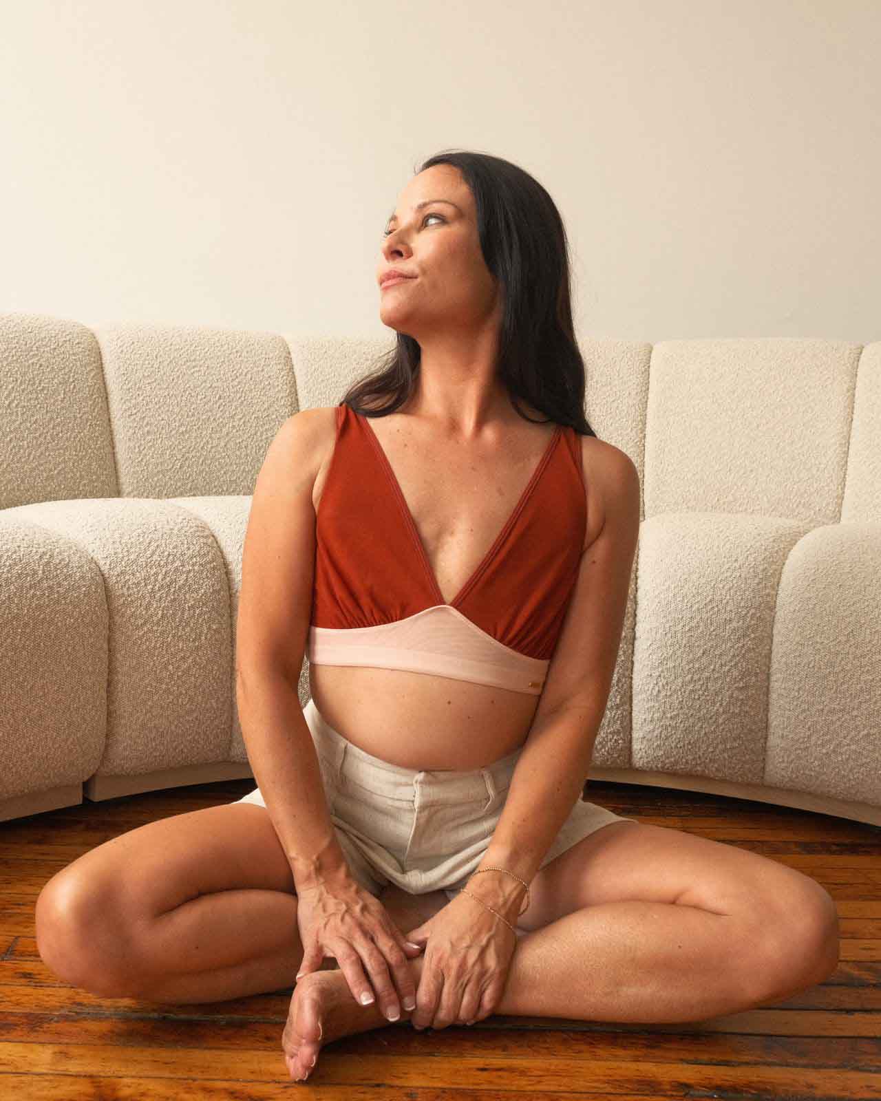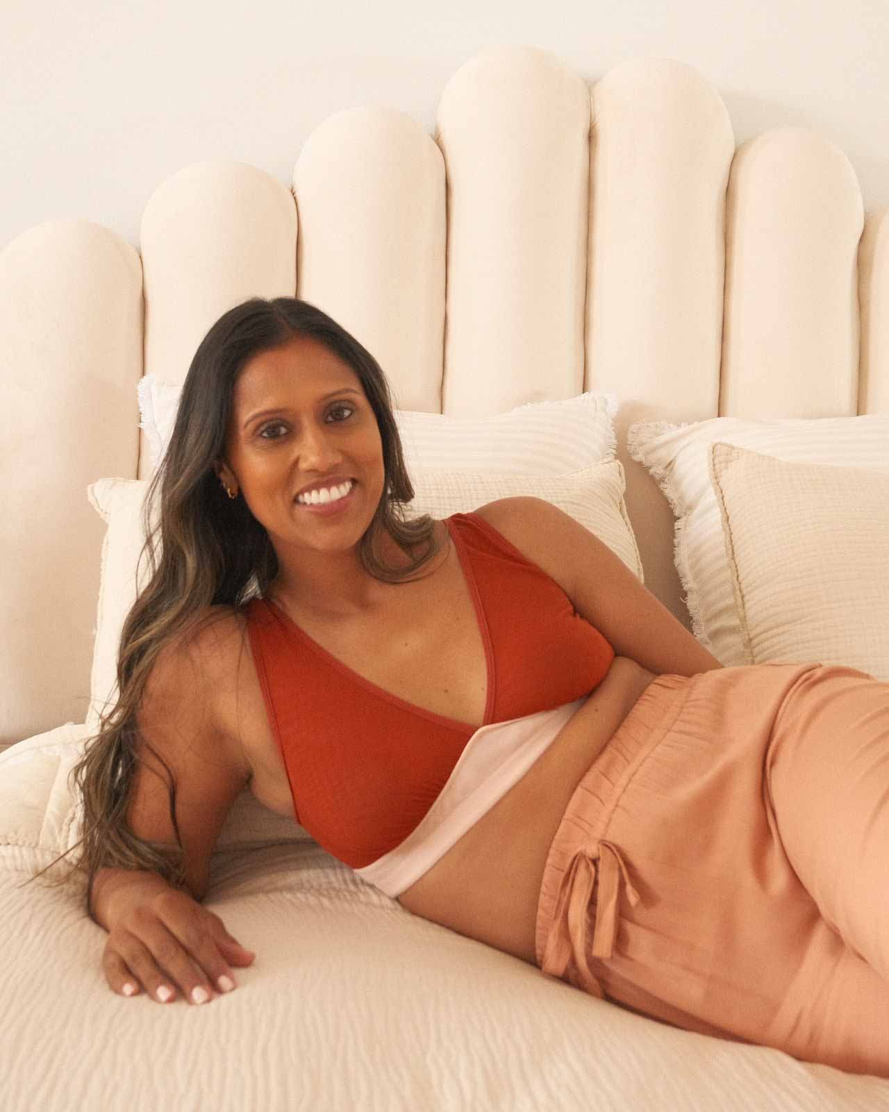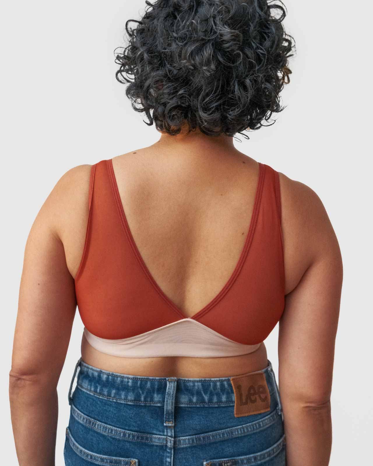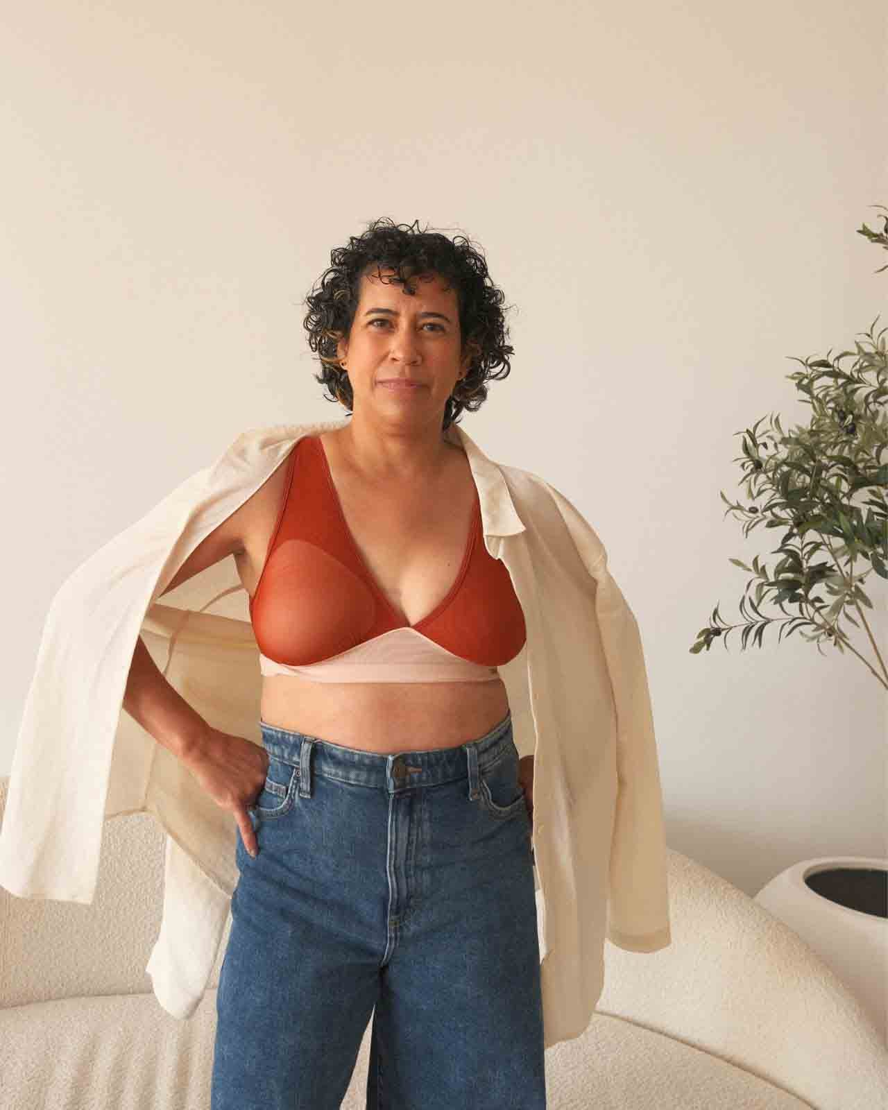 Black / Implants & model wearing the Victoria Pocketed Keyhole bralette with gold lace trim and gold jewel that says anaono Black / Implants & model wearing the Victoria Pocketed Keyhole bralette with gold lace trim and gold jewel that says anaono