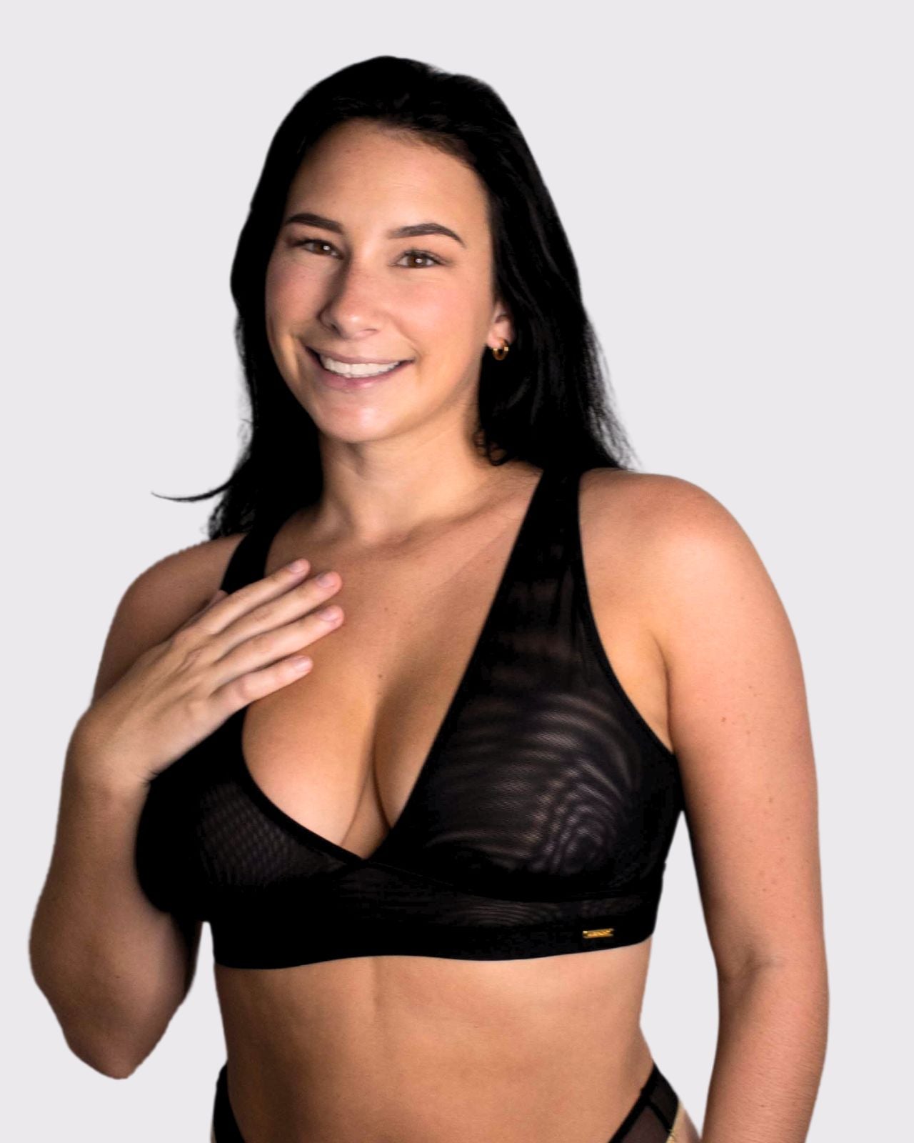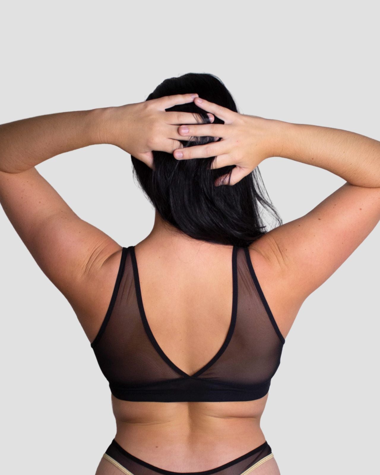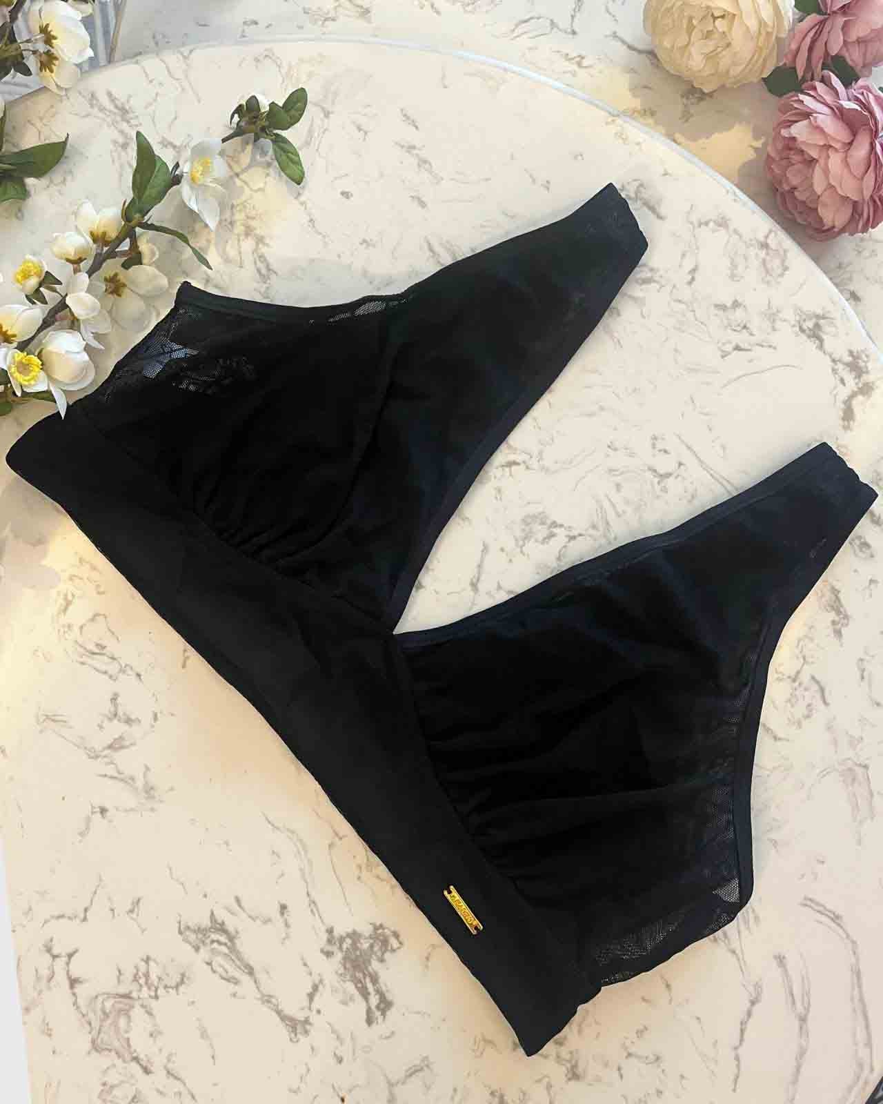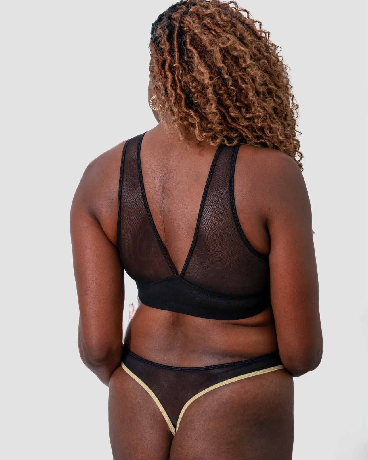 Black & Victoria Mesh Keyhole Bralette with the matching Mesh keyhole brief flat lay image Black & Victoria Mesh Keyhole Bralette with the matching Mesh keyhole brief on implants model