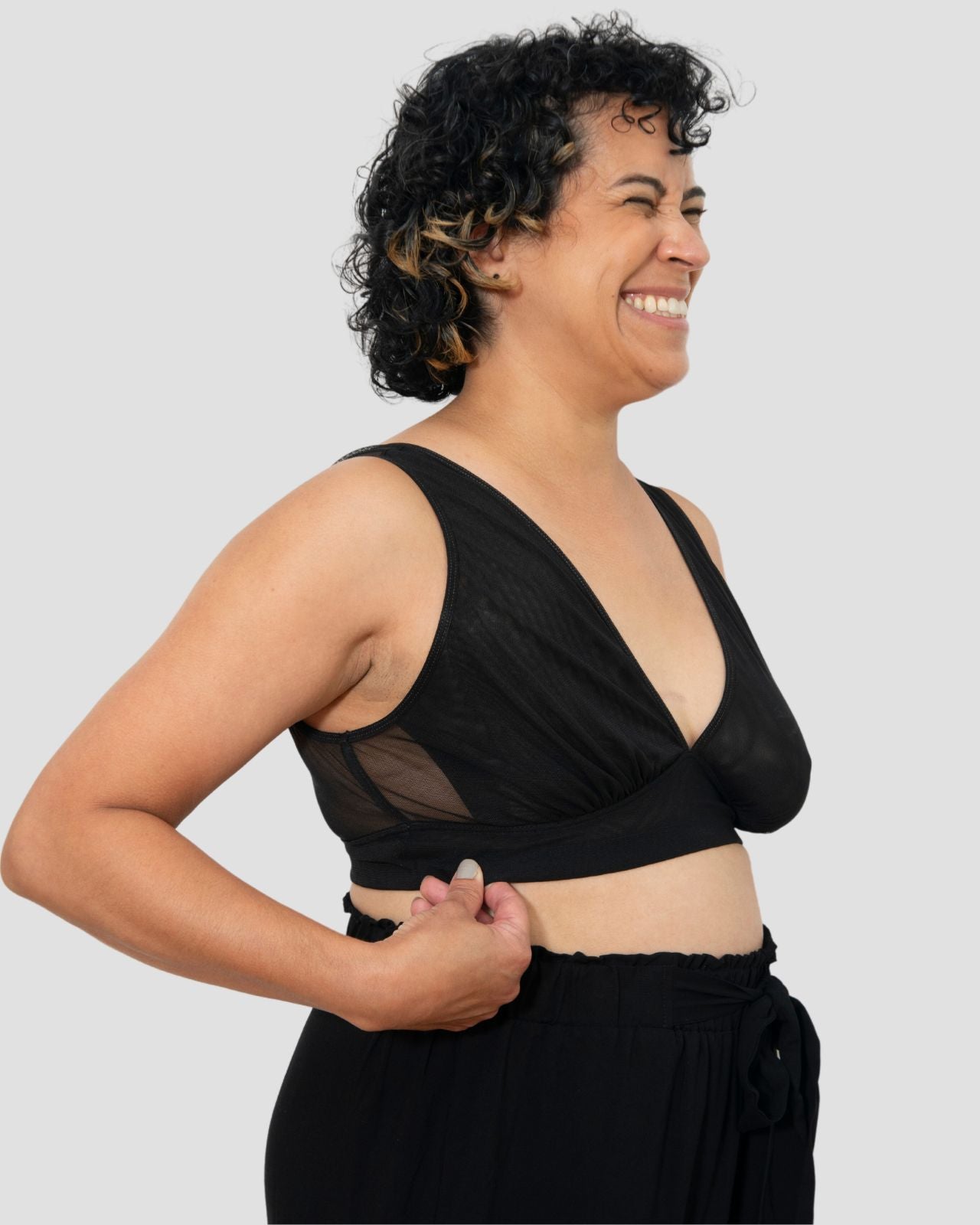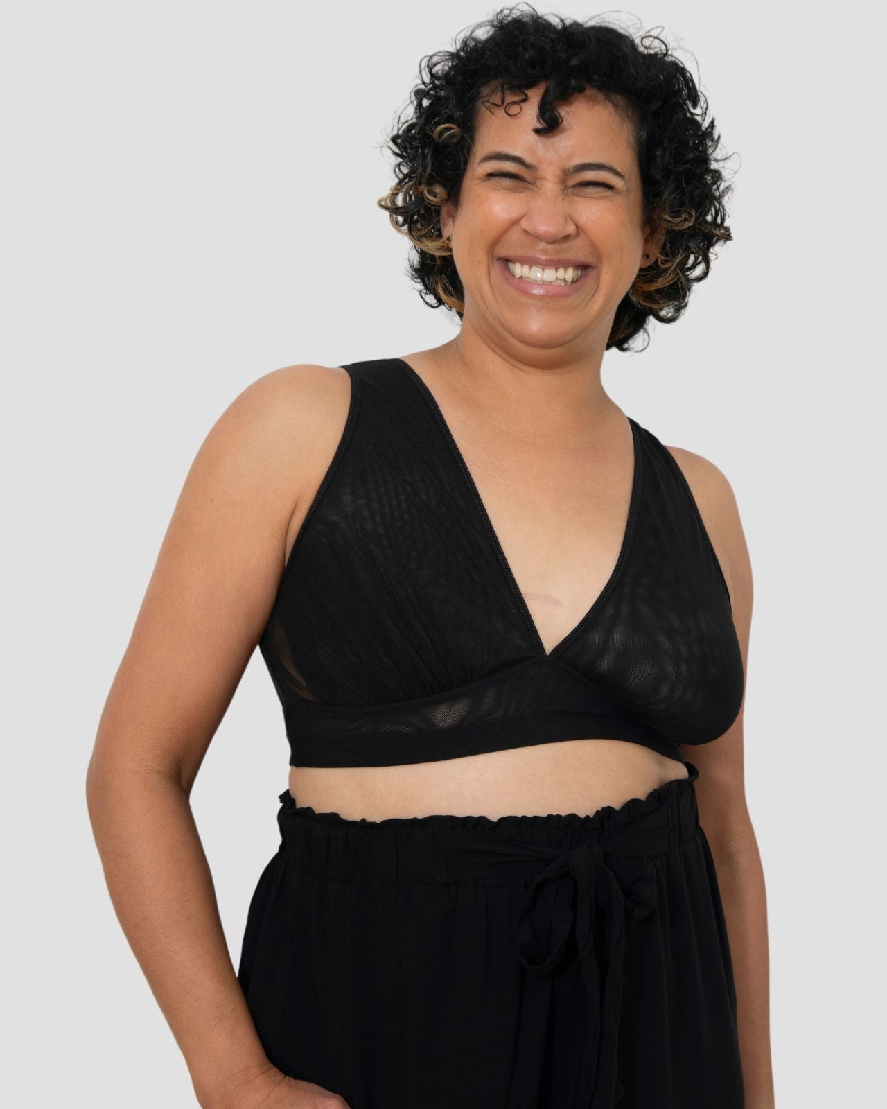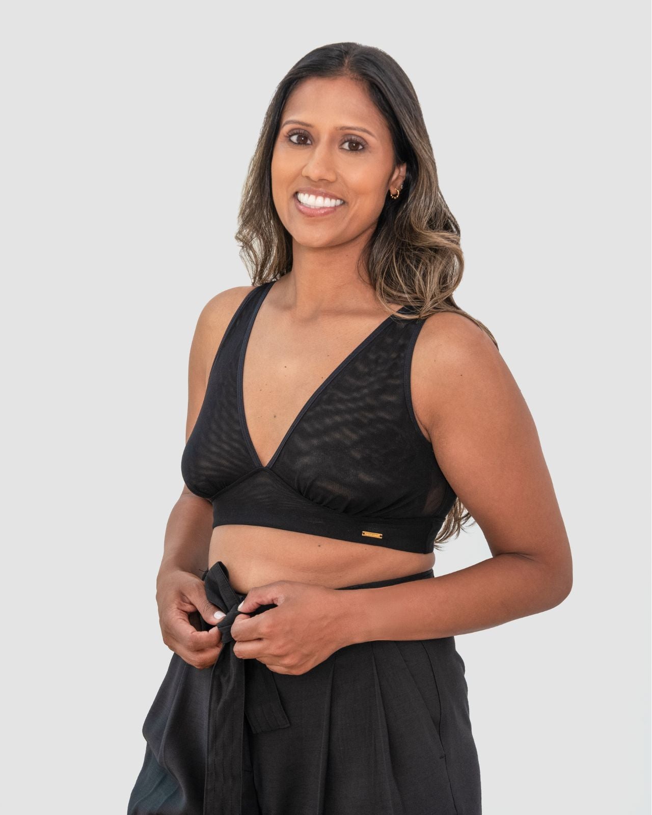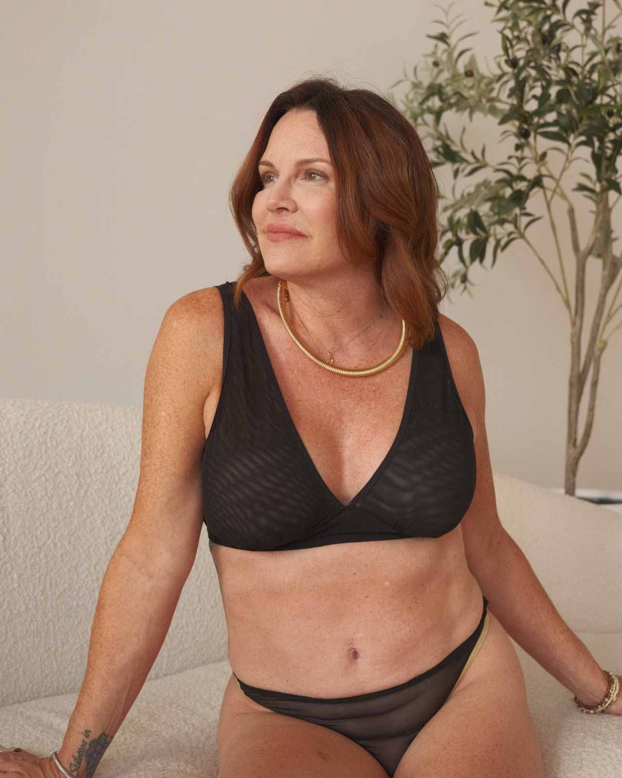Black & Victoria Mesh Keyhole Bralette with the matching Mesh keyhole brief flat lay image Black & Victoria Mesh Keyhole Bralette with the matching Mesh keyhole brief on implants model