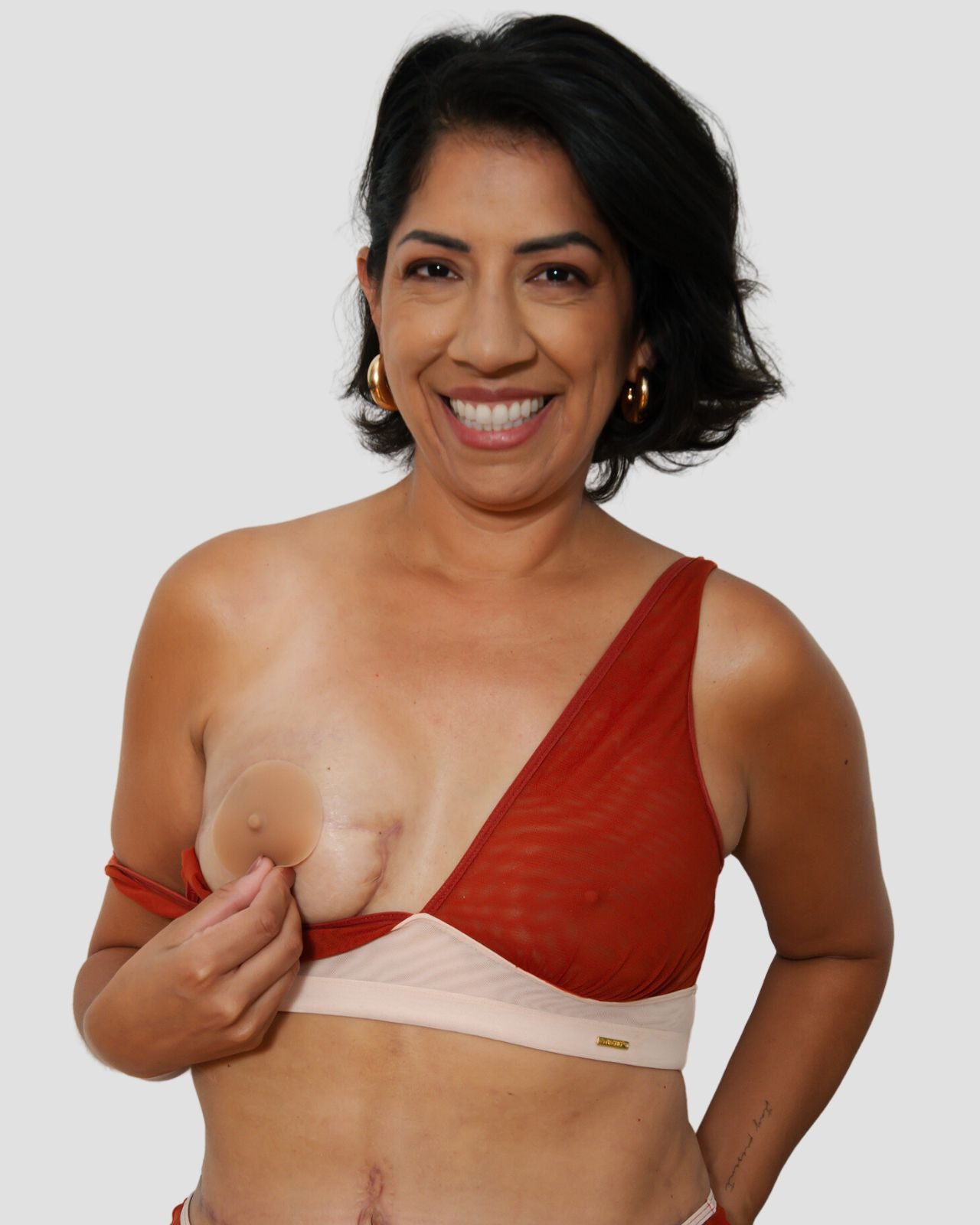 Cashew & flat lay image of all 3 colors of the perkie nipple sets with their matching nipple cases Cashew & fake nipple for mastectomy patients that did not do nipple sparing, with model placing the fake stick on nipple onto their chest