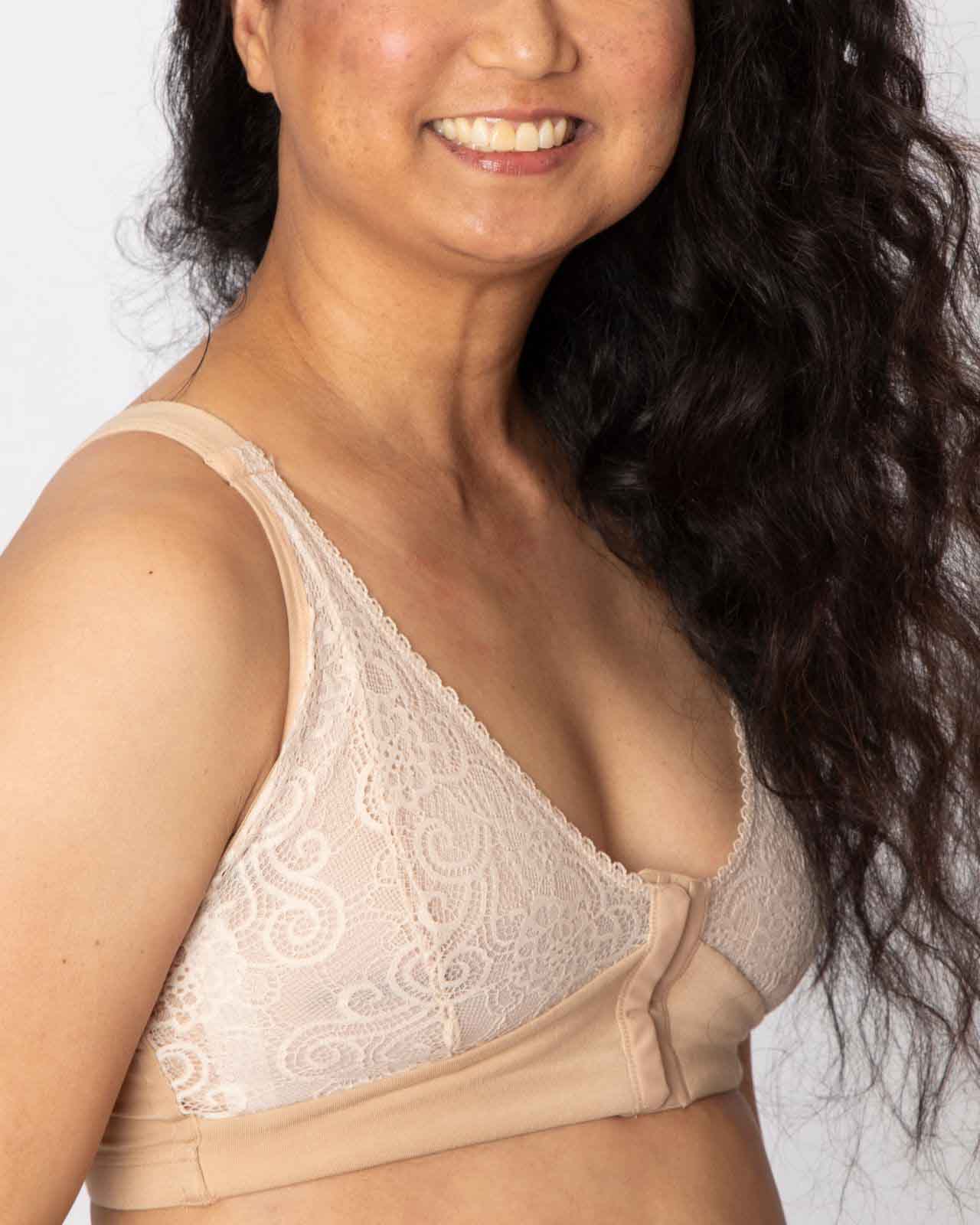 - A lace front closure bra makes it easy to slip in lightweight breast forms or prostheses if you desire a more balanced look