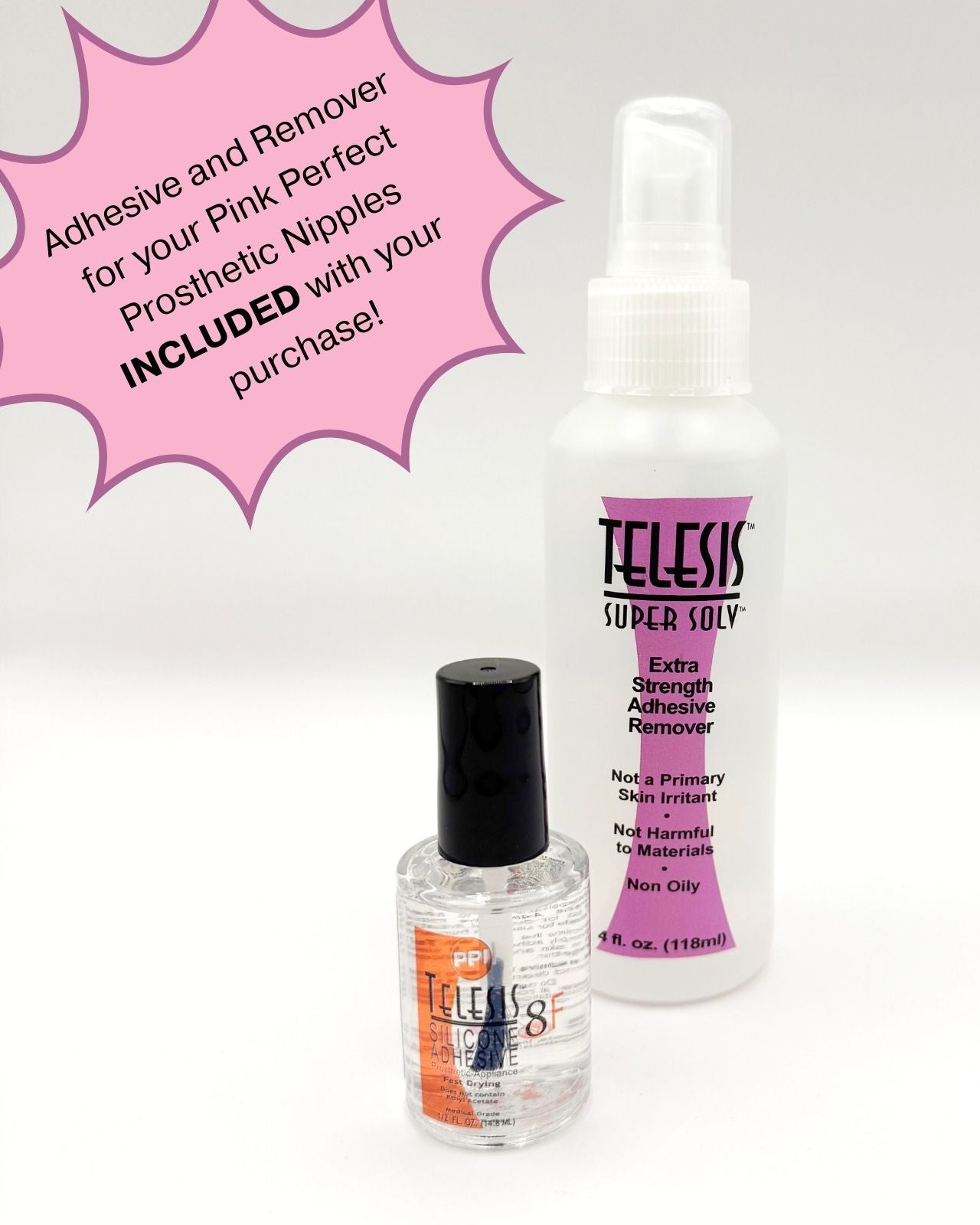 -Includes Medical grade Remover Adhesive Removal added FREE to every purchase of Pink Perfect nipples. This medical-grade adhesive provides a strong, water-resistant bond and can extend the wear up to 14 days. The remover is hydrocarbon based and provides rapid removal of the adhesive without damage to prosthetic nipple. The remover has a slight sent and is non-oily. Adhesive and Remover must be used together