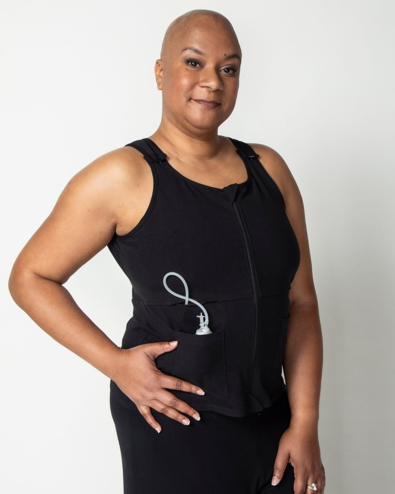 - Strategically placed pockets on either side of the vest store drains and help with healing